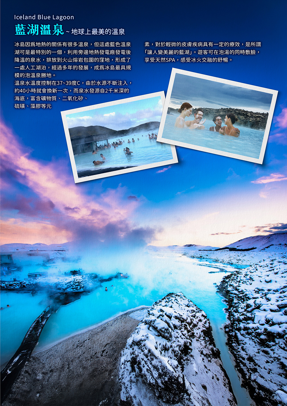 ◎藍湖溫泉 冰島因為地熱的關係有很多溫泉,但這處藍色溫泉湖可是最特別的一個,利用旁邊地熱發電廠發電後降溫的泉水,排放到火山熔岩包圍的窪地,形成了一處人工湖泊,經過多年的發展,成為冰島最具規模的泡溫泉勝地。溫泉水溫度控制在37~39度C,由於水源不斷注入,約40小時就會換新一次,而泉水發源自2千米深的海底,富含礦物質、二氧化矽、硫磺、藻膠等元素,對於輕微的皮膚疾病具有一定的療效,是所謂「讓人變美麗的藍湖」。遊客可在泡湯的同時敷臉,享受天然SPA,感受冰火交融的舒暢。