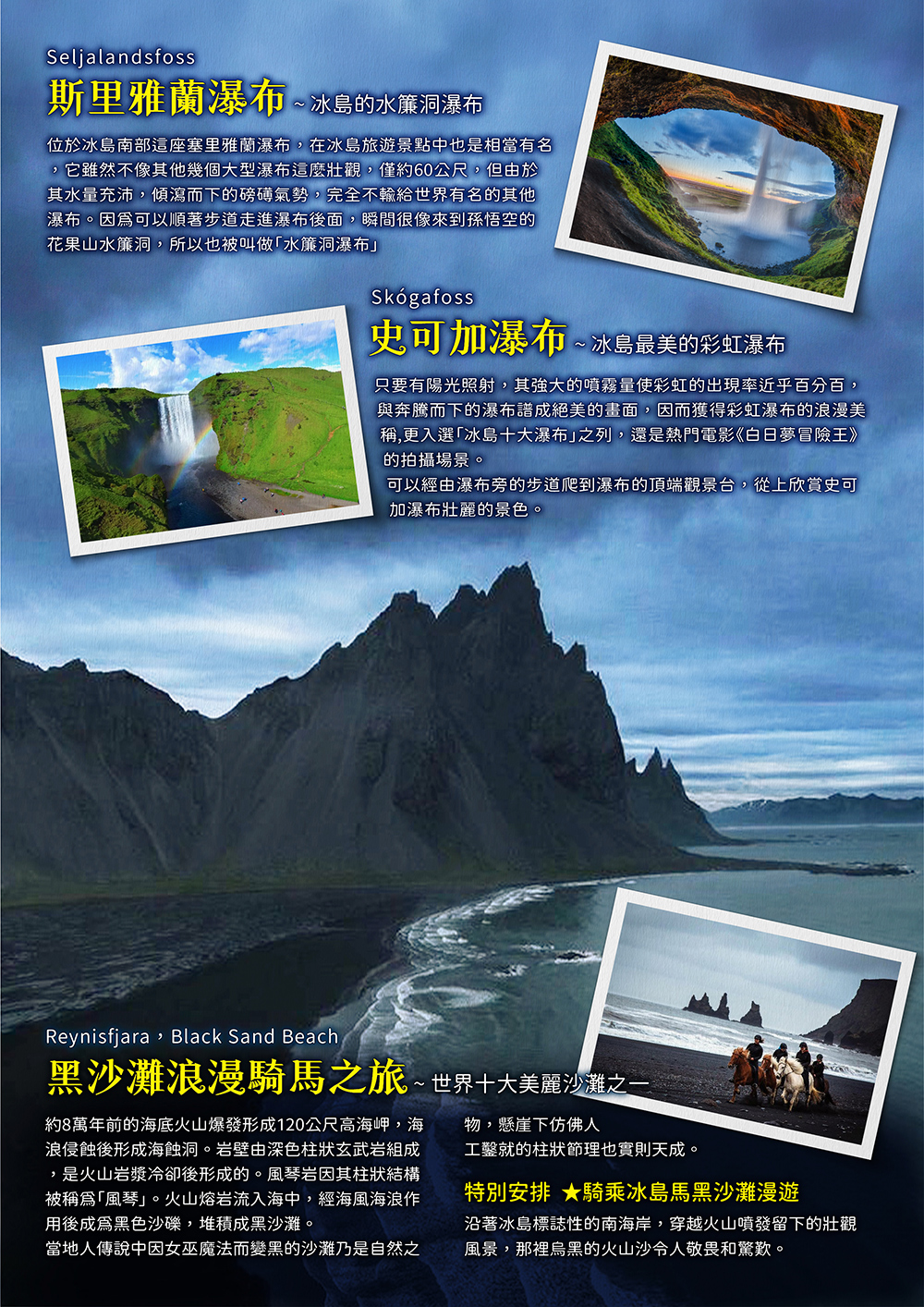 ◎黑沙灘浪漫騎馬之旅 曾列為世界十大美麗沙灘之一。約8萬年前的海底火山爆發形成120公尺高海岬,海浪侵蝕後形成海蝕洞。岩壁由深色柱狀玄武岩組成,是火山岩漿冷卻後形成的。風琴岩因其柱狀結構被稱為「風琴」。火山熔岩流入海中,經海風海浪作用後成為黑色沙礫,堆積成黑沙灘。當地人傳說中因女巫魔法而變黑的沙灘乃是自然之物,懸崖下仿佛人工鑿就的柱狀節理也實則天成。特別安排遊客騎乘★冰島馬,沿著冰島標誌性的南海岸,穿越火山噴發留下的壯觀風景,那裡烏黑的火山沙將令人敬畏和驚歎。