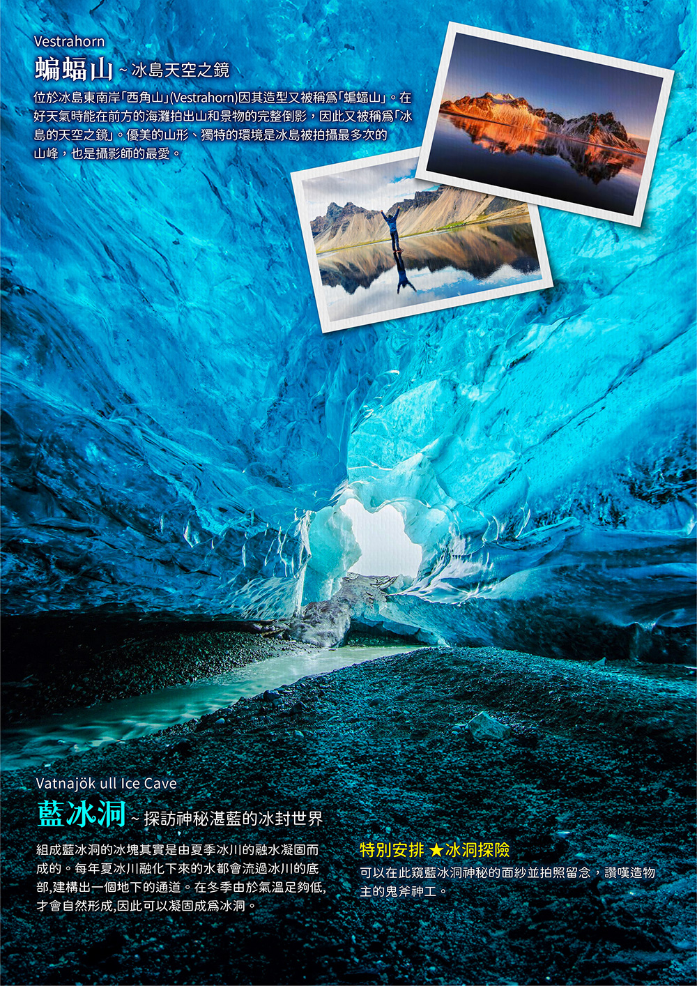 ◎藍冰洞 這些組成藍冰洞的冰塊其實是由夏季冰川的融水凝固而成的。每年夏冰川融化下來的水都會流過冰川的底部,建構出一個地下的通道。在冬季由於氣溫足夠低,才會自然形成,因此可以凝固成為冰洞。特別安排冰洞探險,遊客可以在此窺藍冰洞神秘的面紗並拍照留念,讚嘆造物主的鬼斧神工。
