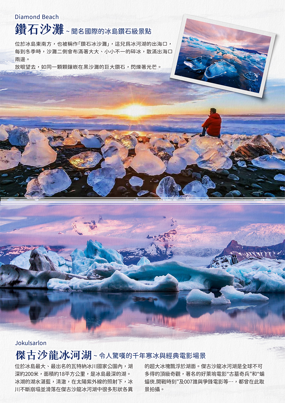 ◎鑽石沙灘 位於冰島東南方,也被稱作「鑽石冰沙灘」,這兒為冰河湖的出海口,每到冬季時,沙灘二側會布滿著大大、小小不一的碎冰,散滿出海口兩邊。放眼望去,如同一顆顆鑲嵌在黑沙灘的巨大鑽石,閃爍著光芒。