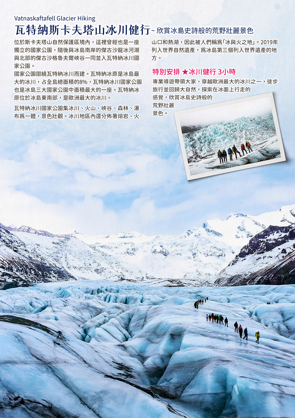 • 斯卡夫塔山冰川健行: 特別安排專業導遊同行,帶領大家穿越歐洲最大的冰川之一,利用3小時的時間,徒步旅行並回歸大自然,探索在冰面上行走的感覺,欣賞冰島史詩般的荒野壯麗景色。