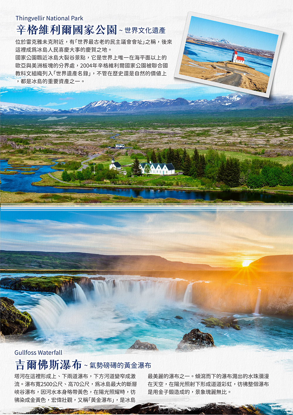• 辛格維利爾國家公園:位於雷克雅未克附近,有「世界最古老的民主議會會址」之稱,後來這裡成為冰島人民喜慶大事的慶賀之地。國家公園臨近冰島大裂谷景點,它是世界上唯一在海平面以上的歐亞與美洲板塊的分界處,2004年辛格維利爾國家公園被聯合國教科文組織列入「世界遺產名錄」,不管在歷史還是自然的價值上,都是冰島的重要資產之一。