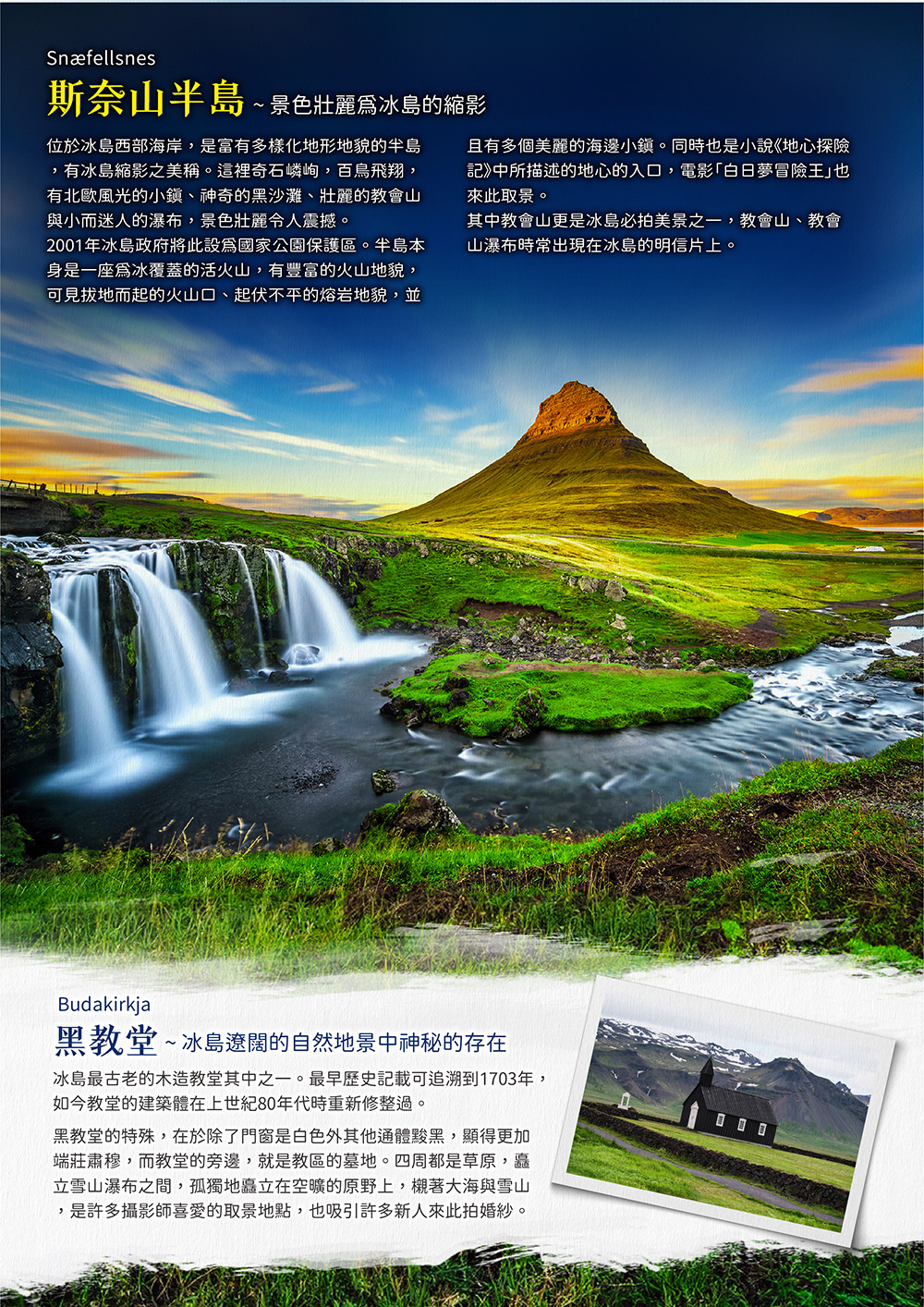 • 斯奈山半島: 位於冰島西部海岸,是富有多樣化地形地貌的半島,有冰島縮影之美稱。這裡奇石嶙峋,百鳥飛翔,有北歐風光的小鎮、神奇的黑沙灘、壯麗的教會山與小而迷人的瀑布,景色壯麗令人震撼。2001年冰島政府將此設為國家公園保護區。半島本身是一座為冰覆蓋的活火山,有豐富的火山地貌,可見拔地而起的火山口、起伏不平的熔岩地貌,並且有多個美麗的海邊小鎮。同時也是小說《地心探險記》中所描述的地心的入口,電影「白日夢冒險王」也來此取景。其中教會山更是冰島必拍美景之一,教會山、教會山瀑布時常出現在冰島的明信片上。