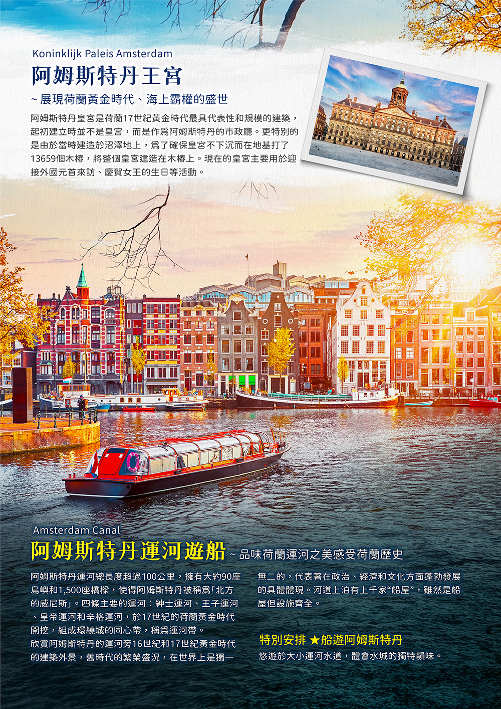 • 阿姆斯特丹運河:阿姆斯特丹運河總長度超過100公里,擁有大約90座島嶼和1,500座橋樑,使得阿姆斯特丹被稱為「北方的威尼斯」。河道上泊有上千家“船屋”,雖然是船屋但設施齊全。特別安排★玻璃船遊覽阿姆斯特丹才,悠遊於大小運河水道,體會水城的獨特韻味。(如遇班機延誤等不可抗力因素,本公司可保留調整或取消,恕無法退費)