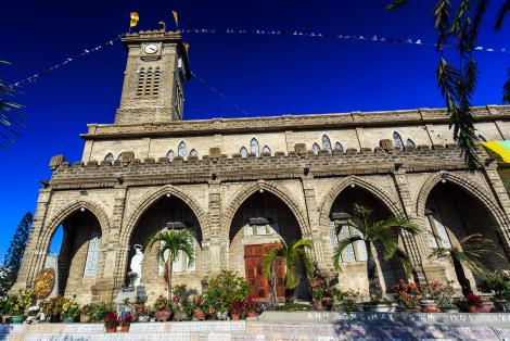 芽莊大教堂以灰色石造結構與哥德式尖塔建築,矗立於高地之上,氣勢莊嚴。彩繪玻璃透進斑斕光影,靜謐氛圍令人沉澱心靈。這座殖民時期遺留的天主教堂,是欣賞建築之美與眺望芽莊市景的絕佳去處。