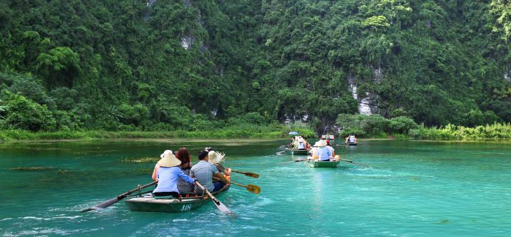 在蜿蜒寧靜的小河中乘著徐徐清風而行,綠油油的叢林覆蓋山麓、石灰岩地形所形成的奇峰異石風光明媚。河畔兩岸風景比下龍灣有勝之而無不及。在山石間浮遊,遠眺一座座孤聳怪立的山巒,讓人緩緩的走進這塊世外桃源的奇景中。