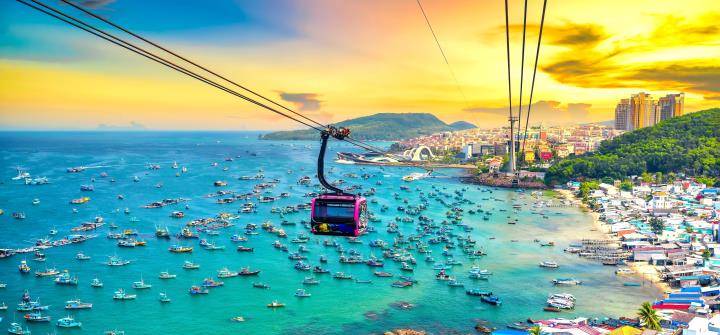 世界上最長的海上纜車,享受360度全開視野的高空巡航,給予遊客一個史無前例體驗,空中看到富國島以最新鮮自然的色彩,描繪這個綠色島嶼擁有的藍色海域,還有當地漁船點綴海面,療癒的畫面賦予旅遊最美好體驗與感受。