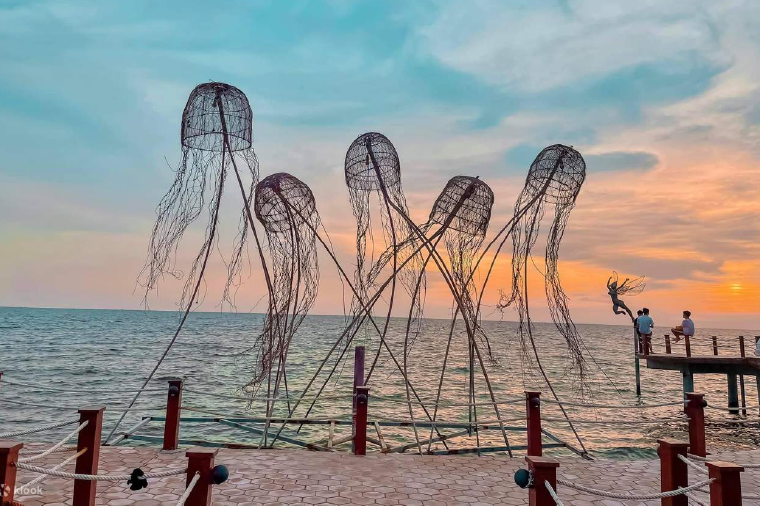 富國島有很多的沙灘跟大海,主要帶給旅客的亮點各有不同!夕陽西下時分,在桑納托日落沙灘,輕輕感受細緻的沙灘、海浪拍打的聲響,在Golden San Bar 像似進入超現實主義大師瘋狂達利私領域中,看到長腳象、長腳鯊、長腳水母等超酷裝置藝術,踏浪戲水之外,您還可以拍出特別好看的旅遊寫真照片。看著眼前超現實的藝術創作隨著太陽落下變換背景,日落餘暉的絕世美景,讓人遺忘世間煩腦,流連忘返於這座人間仙境裡。