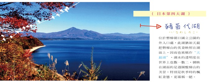 【豬苗代湖】為磐梯山火山活動所形成的淡水湖,位在海拔514m的高地上,面積達104平方公里,最深處水深94.6公尺,是日本第四大湖。像大海一樣寬闊的湖面十分清澈透明,故有「天鏡湖」之稱。天氣晴朗時,磐梯山的倒影映在湖面,襯著如珍珠般鑲在湖岸的白色沙灘,美得讓人心曠神怡!冬天時,北方天鵝群飛來過冬,雪白的天鵝一隻隻降落、於湖面戲耍的姿影,讓豬苗代湖更添幾分清麗動人。