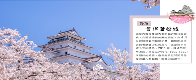 【會津若松城】最早建於西元1384年,迄今有六百多年歷史,此城天守閣之造形有如展開兩翼在空中飛舞的白鶴,姿態優美,因此有『鶴城』之美稱。此城是日本近代有名的歷史舞台,186810月發生的戊辰戰爭中,維新政府軍來到會津若松城下,與代表舊幕府勢力的會津藩士展開決戰。一群年僅1516歲的少年被編成白虎隊奮勇迎敵,彈盡糧絕之際他們感嘆守城淪陷在即,於是20名隊員全體切腹自盡,留下令人唏噓的故事。