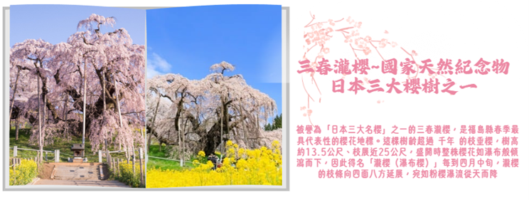 【三春瀧櫻在一年中的多數時間,福島縣 的三春町都只是一個典型農村,當地大約有 17,000 位居民。不過,每到春天就會湧進大約 30 萬人造訪此地,爭睹三春瀧櫻的風采。瀧櫻的意思是指瀑布櫻花,此櫻花在盛開時精緻的粉紅花瓣會呈現絢爛的流瀑狀,而形成令人驚豔的景色,與在日本其它地區欣賞到的櫻花完全不同。