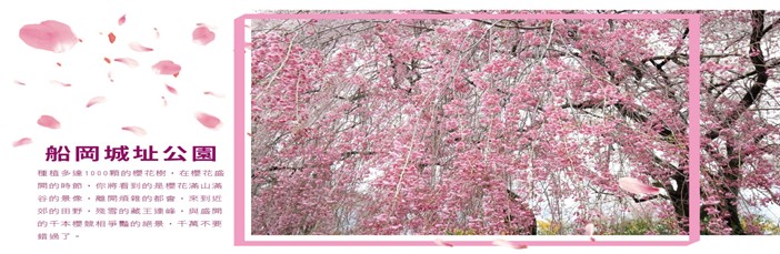 【船岡城址公園】是宮城縣唯一被選定為「櫻花名勝100選」的地方,盛開時滿山都被染成櫻色,與24公尺高的「船岡和平觀音」平齊視線、共望遠方,身旁櫻粉燦爛,令人不禁身心舒暢。穿過公園中橫跨於鐵軌之上的橋,迎面而來的是河畔幾乎無邊無際的爛漫櫻花
