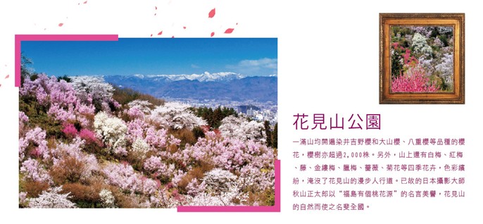 【花見山公園】—滿山均開遍染井吉野櫻和大山櫻、八重櫻等品種的櫻花,櫻樹亦超過2,000株。另外,山上還有白梅、紅梅、藤、金縷梅、臘梅、薔薇、菊花等四季花卉,色彩繽紛,淹沒了花見山的漫步人行道。已故的日本攝影大師秋山正太郎以“福島有個桃花源”的名言美譽,花見山的自然而使之名斐全國。