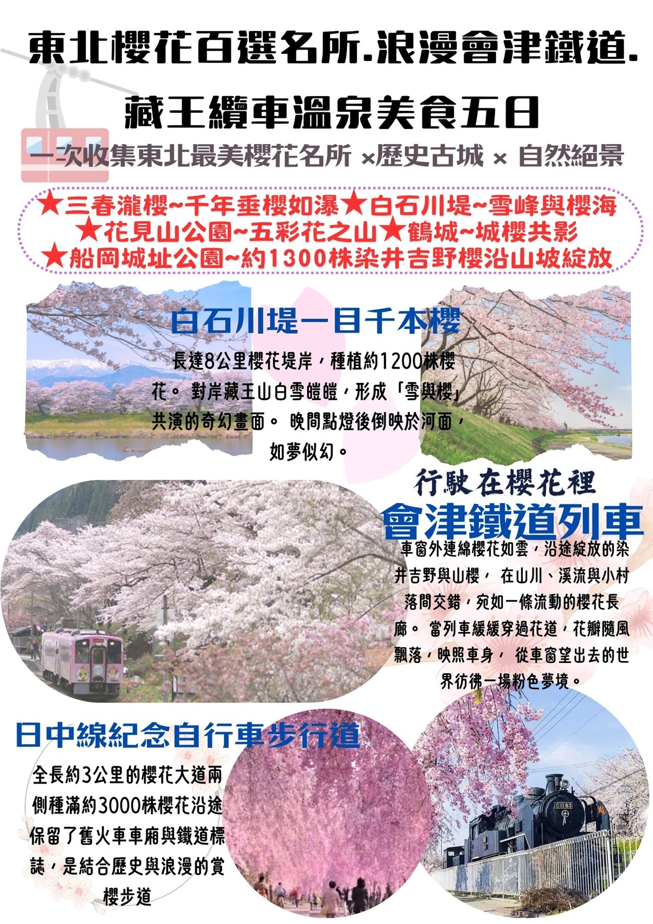 2026東北櫻花百選名所.浪漫會津鐵道.藏王纜車溫泉美食五日