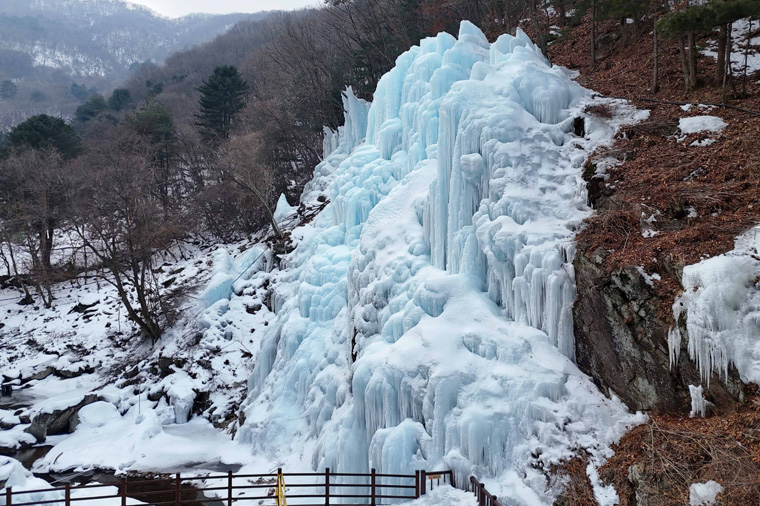 【魚飛溪谷冰川】涼爽的溪谷就是魚飛溪谷。作爲京畿道清淨溪谷的一環,沿溪谷設置了甲板路,冬季時從甲板橋和溪谷中央像噴泉一樣灑水。
