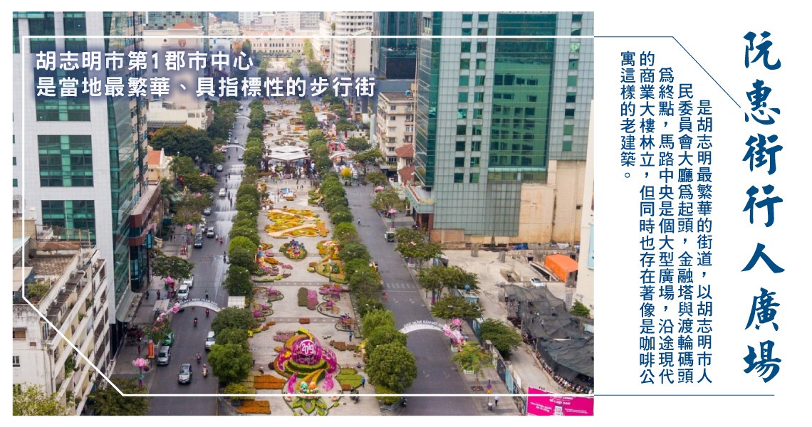 【探索西貢步行散策】是市中心最繁華的街道,玻璃帷幕高樓林立左右,酒店與各式餐館也穿插其中,起點是市政廳及胡志明廣場走到底就到西貢河畔,這條街是到訪胡志明必去之地,每整點就會有水舞表演,這裡每天晚上七點以後封街成為行人徒步區,廣場人群更是各色各樣,晚上的時候有年輕人聚集聊天或表演,也是胡志明市民假日休閒的最佳去處。
