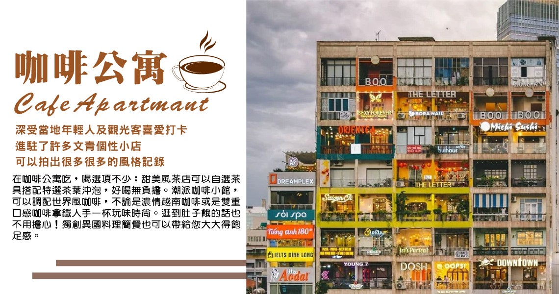 【Café Apartmant咖啡公寓】必去的胡志明市近來深受當地年輕人及觀光客喜愛打卡Café partmant咖啡公寓是個新鮮有趣的體驗。整棟公寓樓層不高但進駐了許多文青個性小店,不論是公寓外觀自然光線外拍或是探索每個樓層不同類型店家,可以拍出很多很多的風格記錄。在咖啡公寓吃,喝選項不少:甜美風茶店可以自選茶具搭配特選茶葉沖泡,好喝無負擔。潮派咖啡小館,可以調配世界風咖啡,不論是濃情越南咖啡或是雙重口感咖啡拿鐵人手一杯玩味時尚。逛到肚子餓的話也不用擔心!獨創異國料理簡餐也可以帶給您大大得飽足感。