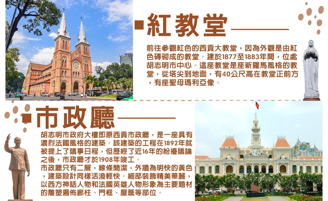 【紅教堂】前往參觀紅色的西貢大教堂,因為外觀是由紅色磚砌成的教堂。建於1877至1883年間,位處胡志明市中心。這座教堂是座新羅馬風格的教堂,從塔尖到地面,有40公尺高在教堂正前方,有座聖母瑪利亞像。