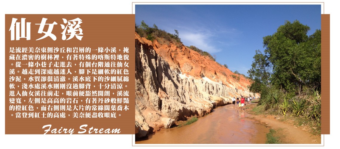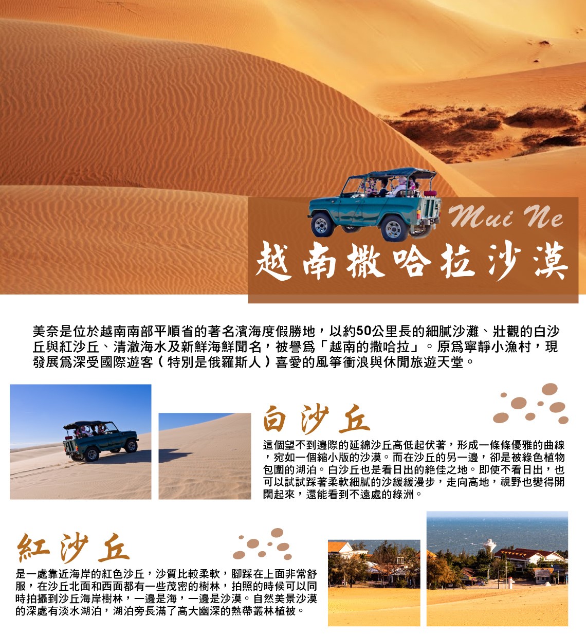 【紅沙丘】略帶紅棕的黃沙色,有如中西部荒漠的色彩。安排搭乘越野吉普車出遊~超好拍沙漠風情紅沙丘、赤腳漫步於喀斯特地形的仙女溪。搭乘ATV沙地越野車,探索一望無際的白沙丘,自由狂野飆沙,帶您體驗極致刺激!