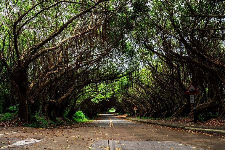 昔日光禿禿的水泥道路,由幹訓班駐軍於民國78年之前,在道路兩旁種植下抗風耐潮的榕樹,三十年後,經由高壓的東北季風和光和作用的反方向導引,終於形成今日西莒最具風情的綠色林蔭隧道。